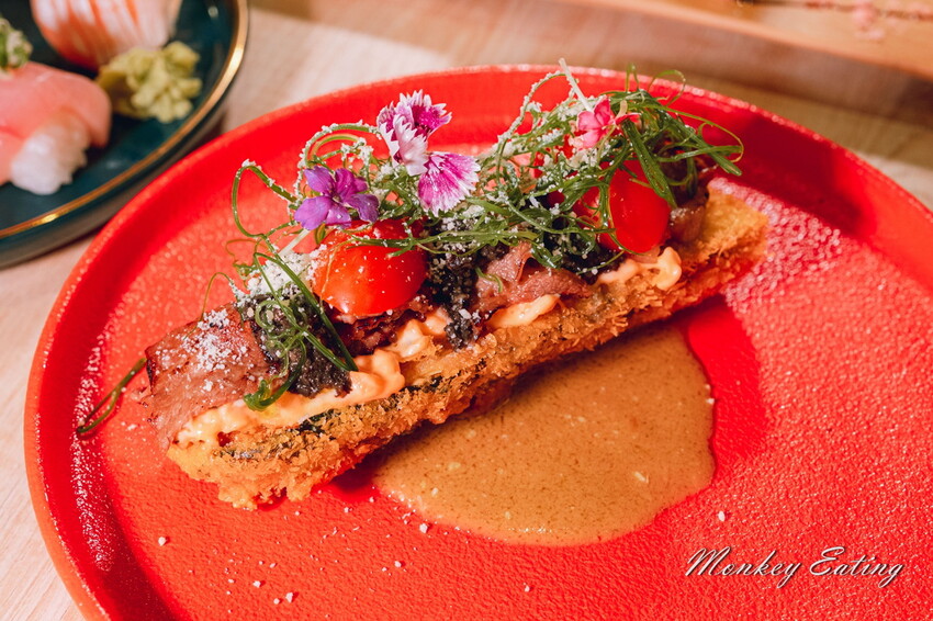 不得不說他們家的天婦羅炸物也很厲害啊~將節瓜裹上粉下去油炸,接著放上松露醬牛肉跟其他配料,擺盤也相當美