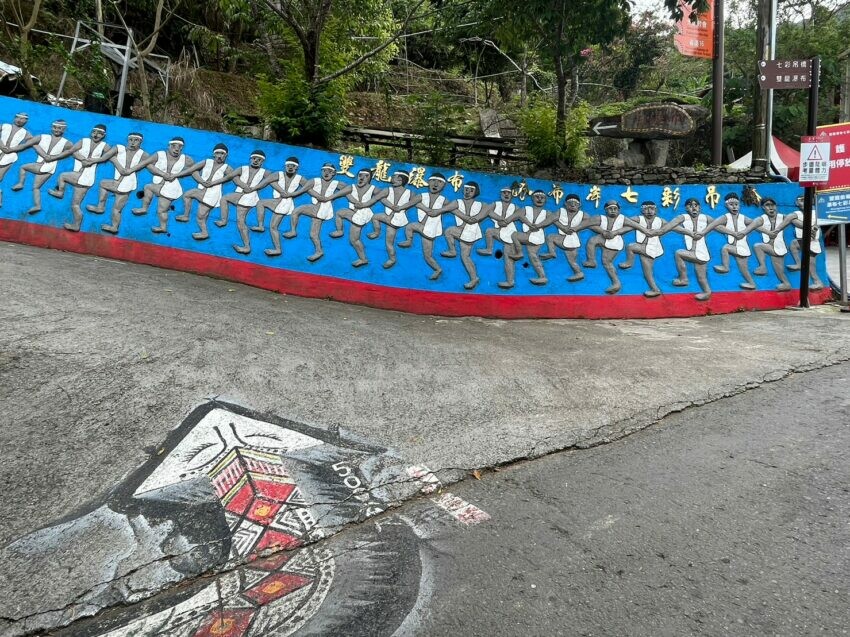 搭乘豐榮客運6288下車後至雙龍瀑布七彩吊橋入口處需步行約1公里,地上都會有箭頭標示前往方向,沿途也會指示牌告訴遊客已步行多遠,跟小編一樣方向感不好的,完全不用怕迷路喔。經過藍色原住民特色牆面後,表示你已經走五百公尺囉,再走五百公尺就會到雙龍瀑布七彩吊橋園區的入口處了。