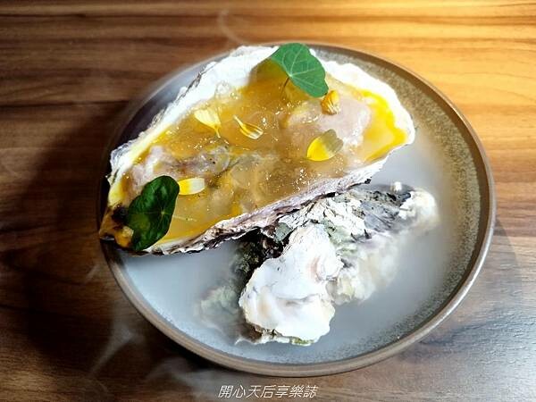 開胃菜 - 現挖生蠔$200(1顆),服務人員先來段上桌秀,以加了薑汁精油的熱水淋在盤底,瞬間聞到淡淡薑味,同時煙霧飄逸,看起來好仙~