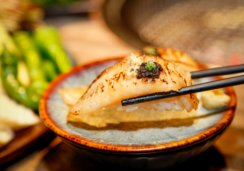 經過炙燒的比目魚鰭邊肉油脂相當豐厚,入口即化的香氣,在嘴裡散發開來,先嚐了這道就有好的開始~