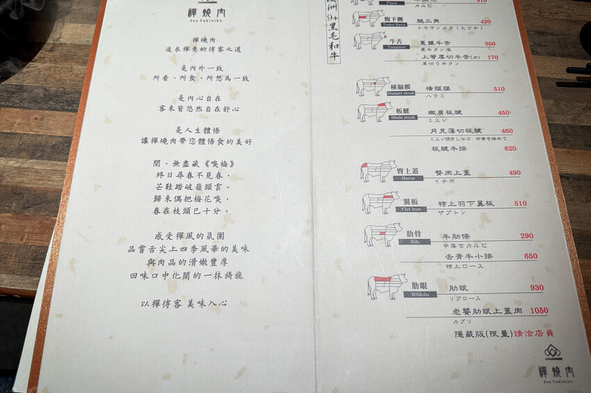 和牛有澳洲9+黑毛和牛和日本鹿兒島A5+和牛兩種選擇,各個部位都可以點,還有圖示也可以學一下牛肉部位處。