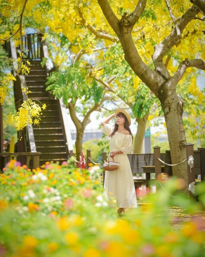 這幾年因為氣候較熱的關係,讓阿勃勒出現大滿開,連帶著跑出一些台南阿勃勒秘境點,蘇林里河堤公園就是其中之一。河堤邊種植兩排阿勃勒樹,當花朵滿開時就會形成一座黃金隧道,這時如果再有微風吹過,就仿佛走在一條金黃色的地毯上,也難怪有這麼多網紅都選擇到這裡拍網美照,實在太夢幻了啊!
