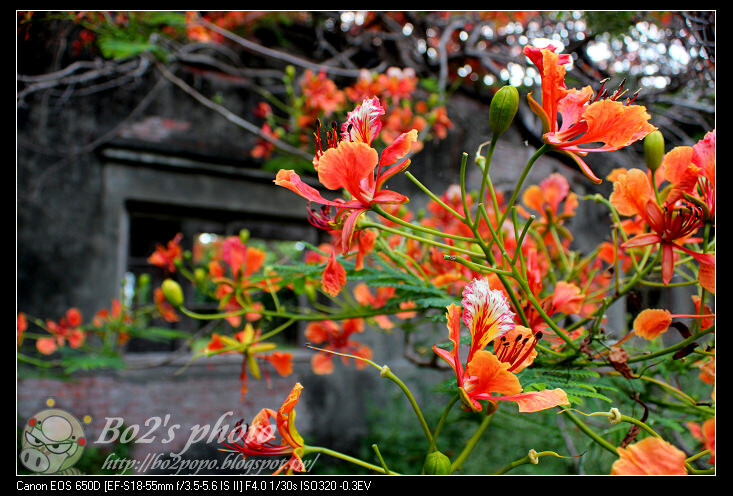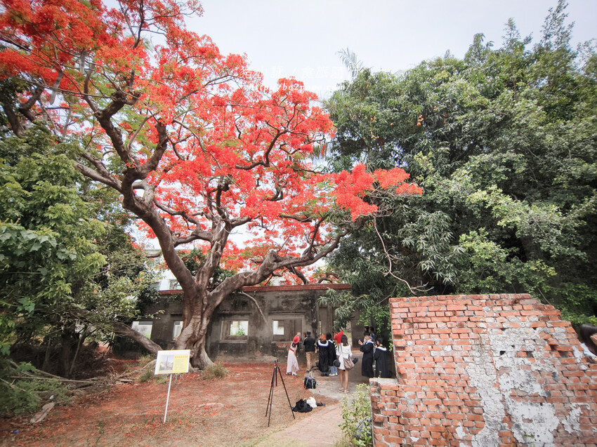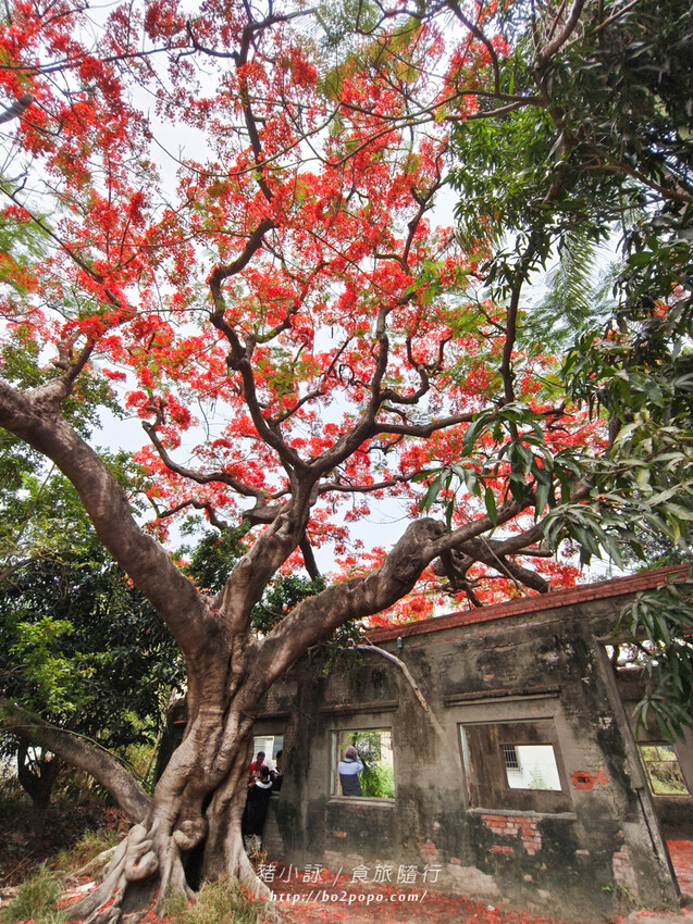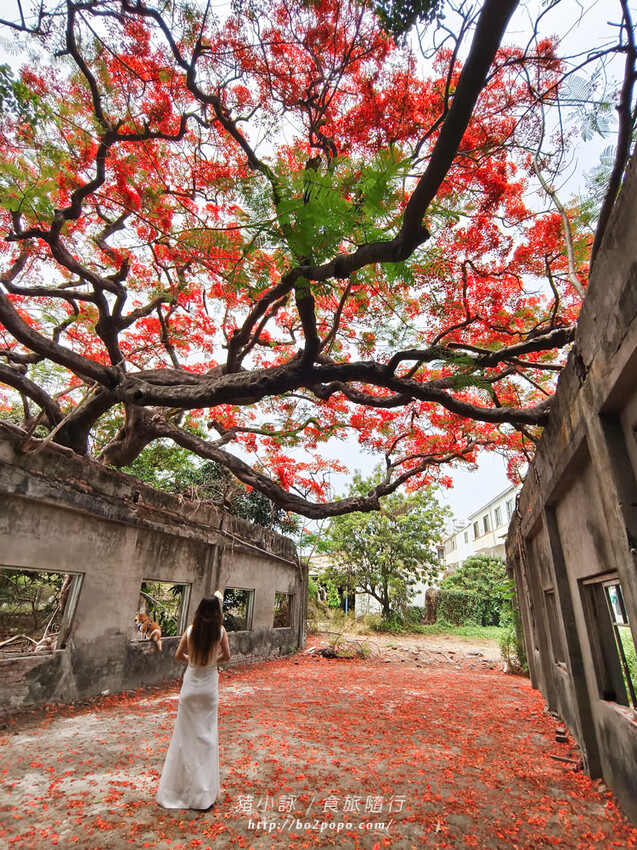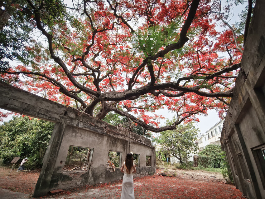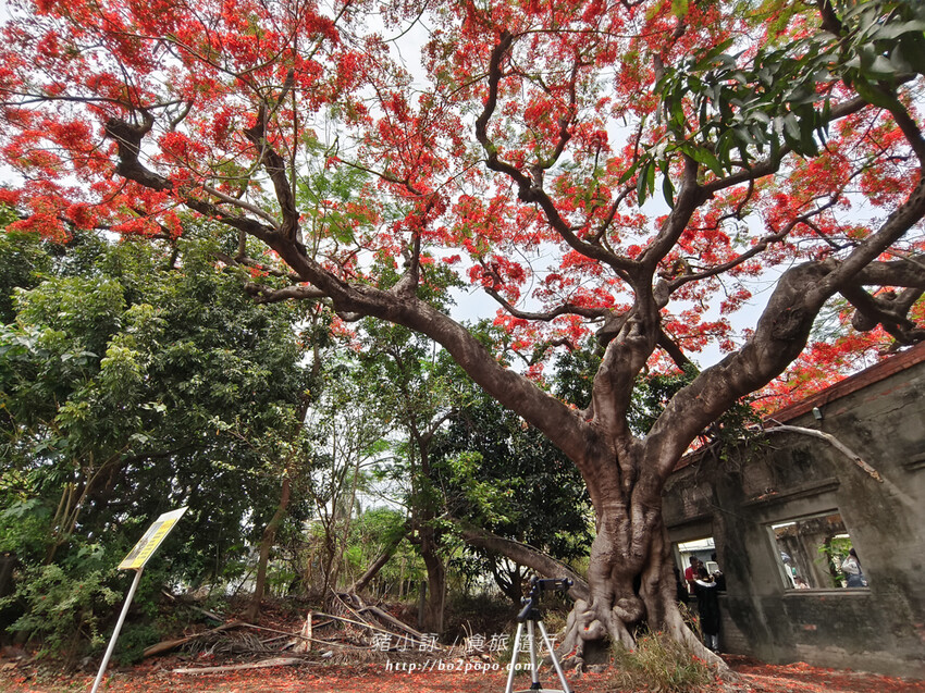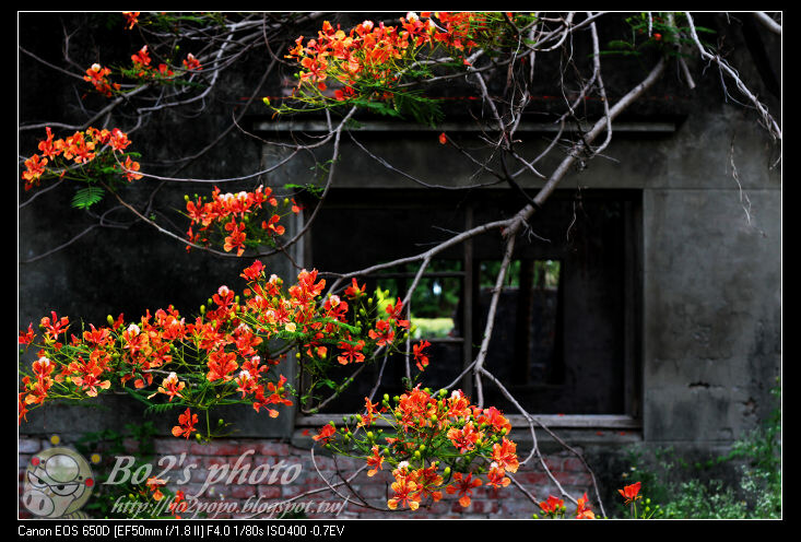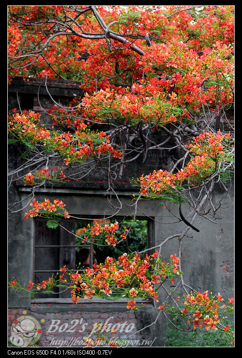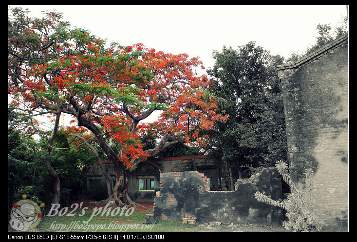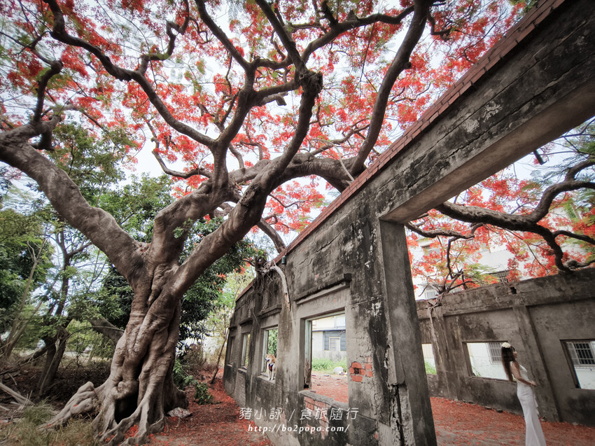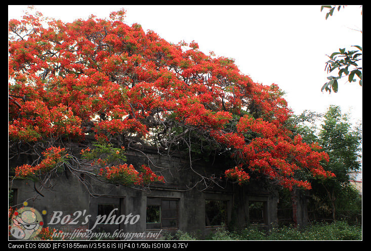 殘破的廢虛內,矗立了一顆大滿開的鳳凰花樹,是個很奇特的景像。