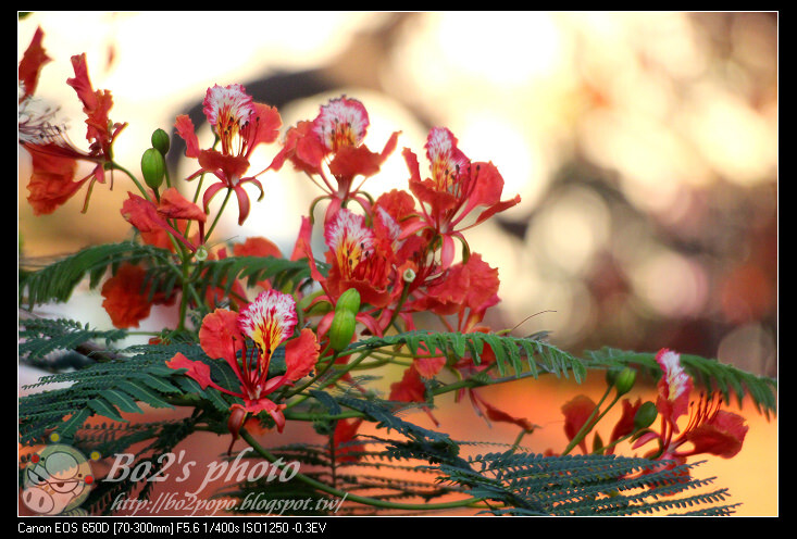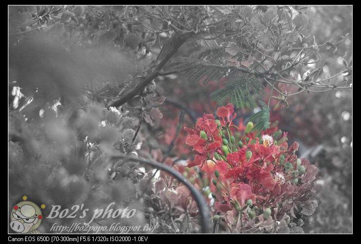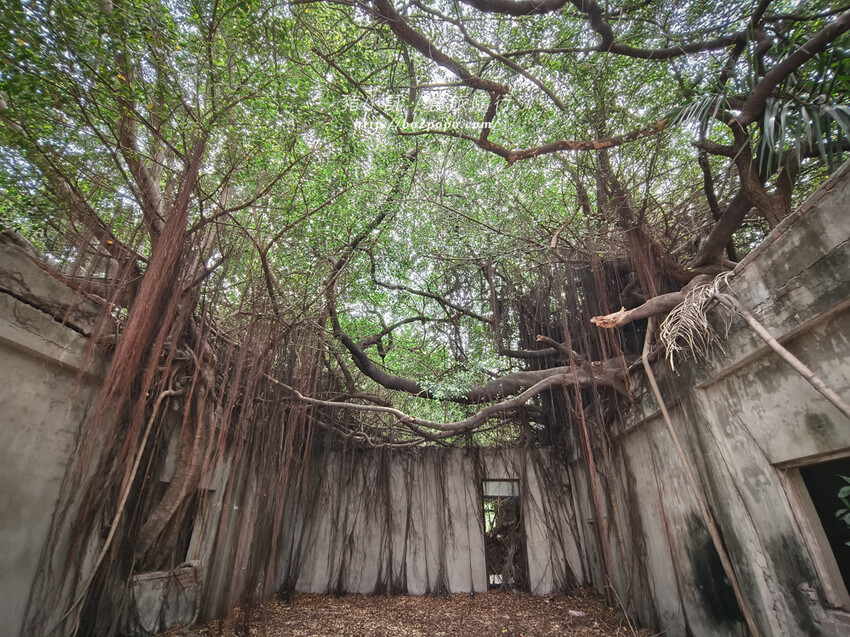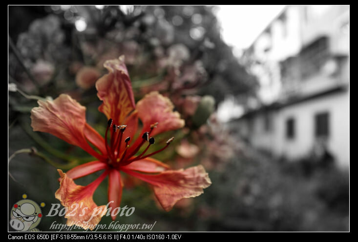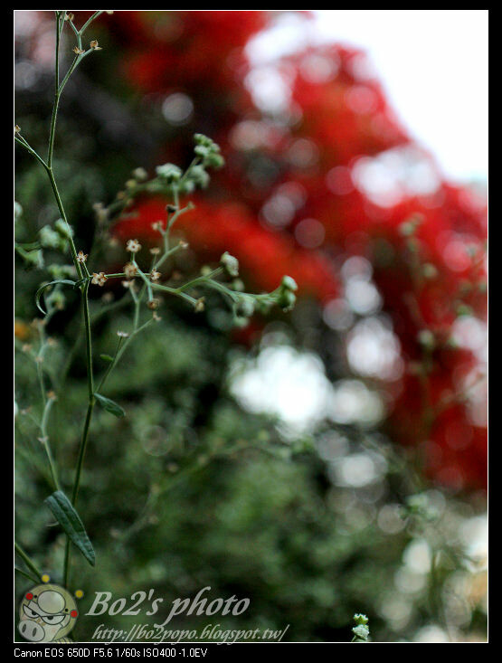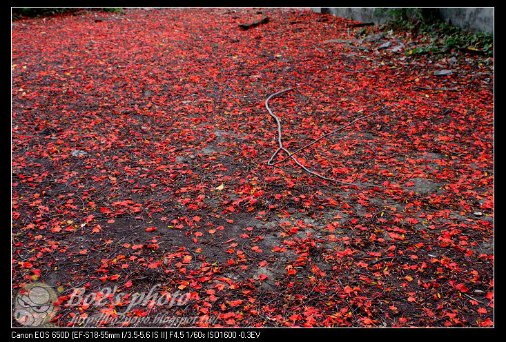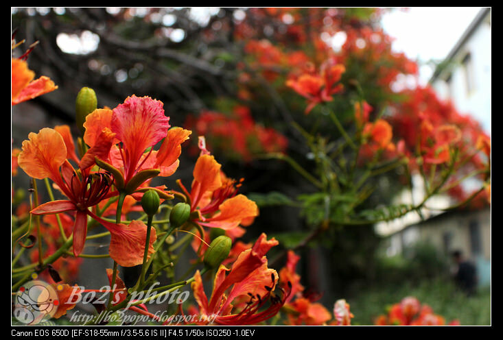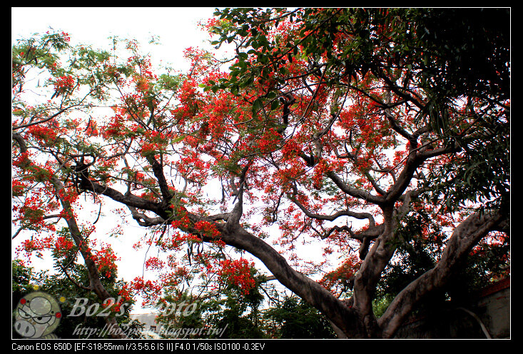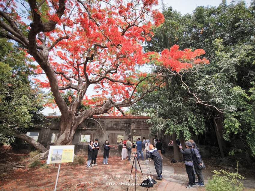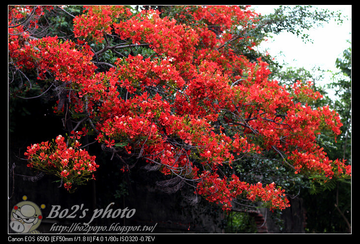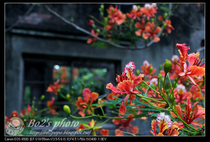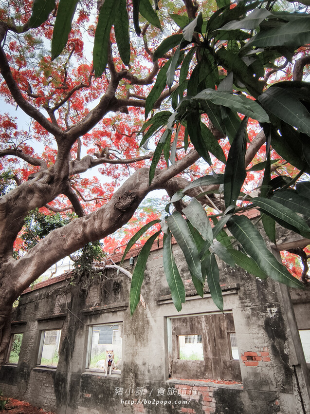 殘破的廢虛內,矗立了一顆大滿開的鳳凰花樹,是個很奇特的景像。