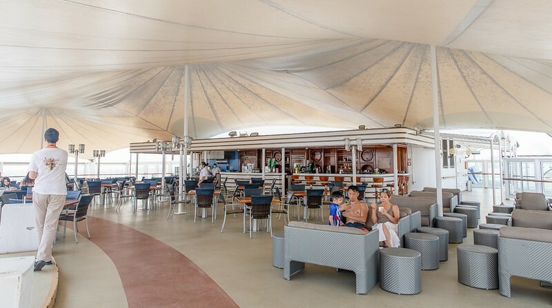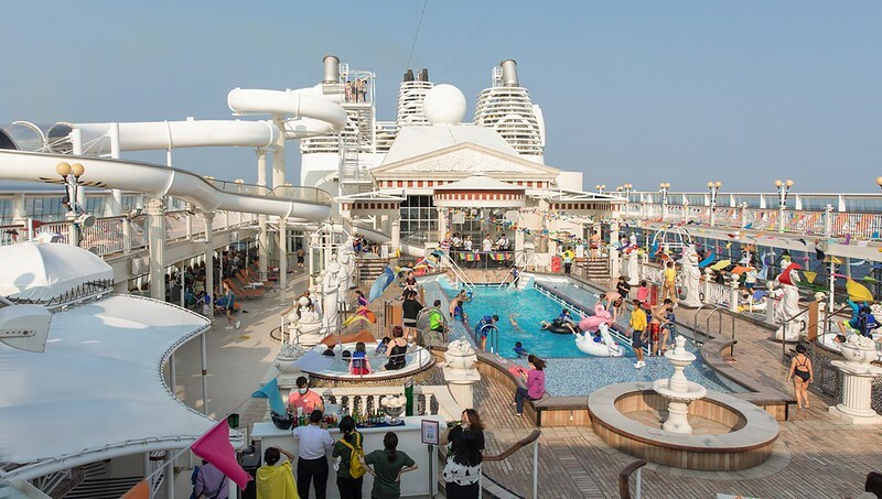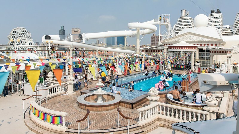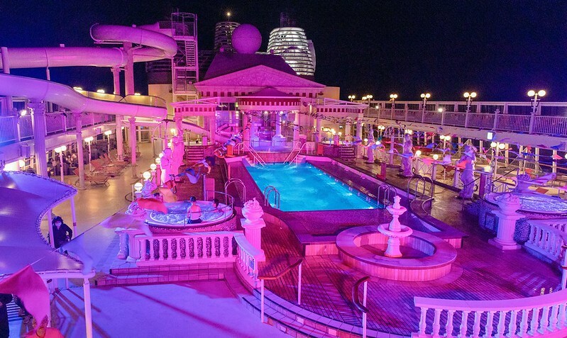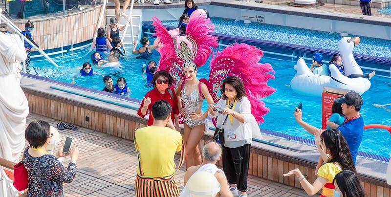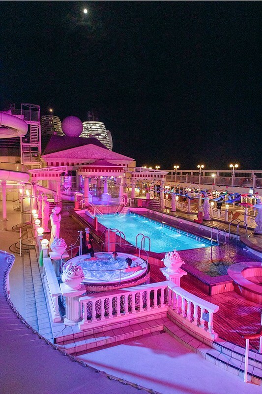 我這不是才吃完飯,船都還沒離開高雄港,像是熟門熟路的旅客怎都換上泳裝玩起水來了。羅馬泳池位於甲板12樓,以仿古羅馬為設計主題的戶外泳池,備有凱薩滑梯、按摩池、現場樂隊表演舞台及大型LED屏幕,兩旁有許多躺椅可供暢泳及做日光浴,這才是郵輪的人生,一旁某位同行的媒體朋友這樣感嘆著。