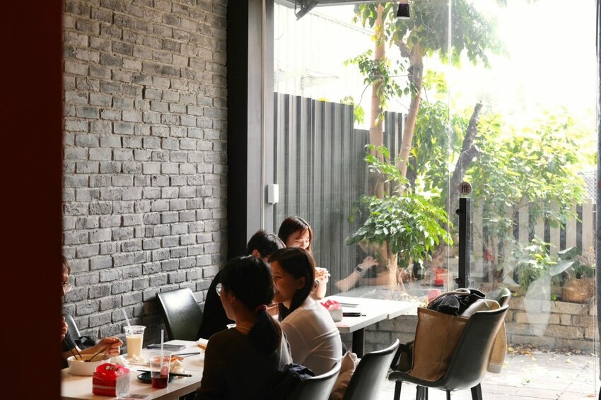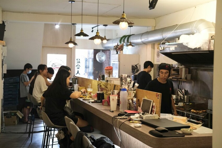 ▼【當個晨食人】店內延續俏皮的裝潢風格,以灰色與紅色系為設計主軸,充滿簡約現代的文青風格,採取狹長型的用餐環境,前面區域是適合一人的吧台座位區,後方區域則是可容納多人的四~六人座位區。
