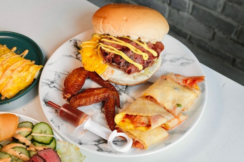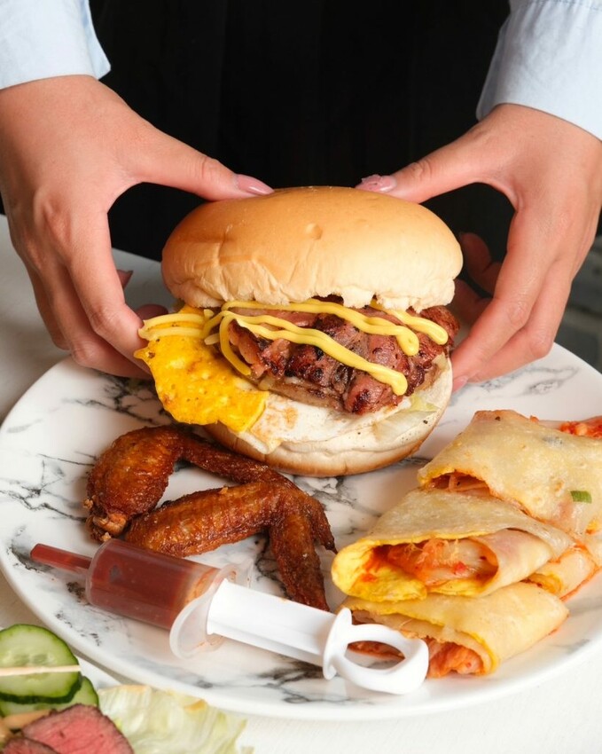 ▼漢堡控要點的這道韓牛來了,以疊高高的韓風牛肉堡為主角,還有泡菜蛋餅和兩隻烤雞翅,並且附上針筒造型的辣醬自行調味,辣醬辣勁十足要小心添加,韓風牛肉堡夾著現煎牛肉排、生菜、辣醬等,用料實在大到一手無法掌握,辣醬交織濃郁牛肉香,張大嘴吃下口感紮實又過癮!