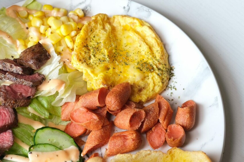 ▼營養指數滿分的菲牛牧場,有肉有菜有蛋整份相當豐富,簡單調味的菲力牛,吃起來軟嫩不會難咬 ,還有小熱狗、歐姆蛋、玉米和大量生菜,搭配烤到香酥的牛角可頌很有飽足感~