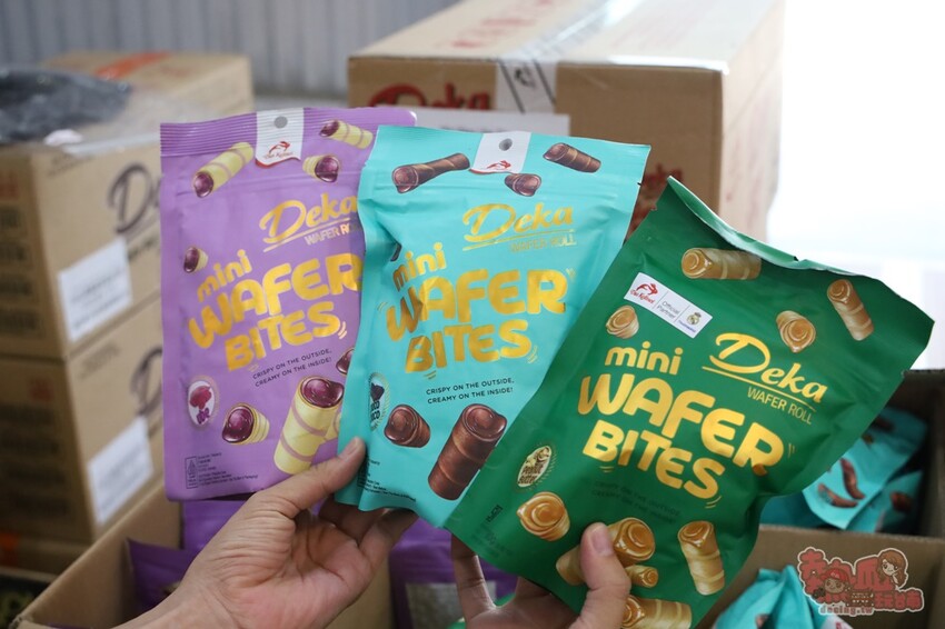 印尼國民點心迷你捲心酥,共有三種口味,分別有花生、紫薯、巧克力口味;另還有香脆米餅,從外包裝看也很像捲心酥的概念,而且還有巧克力及草莓口味喔。