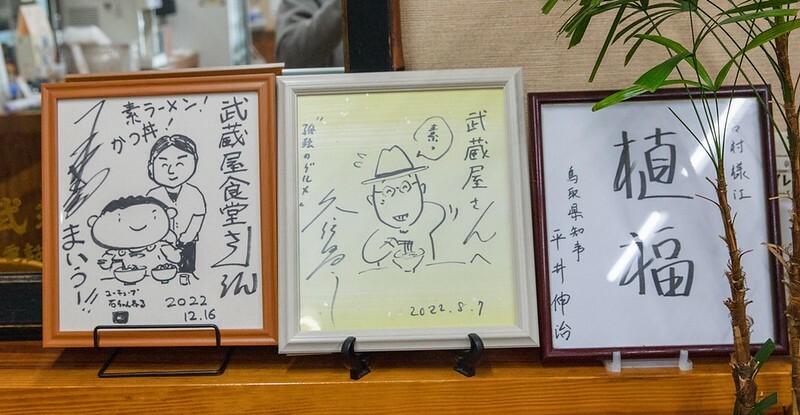再說得詳細一點,漫畫版的素拉麵,登場的是素拉麵的元祖店「武藏屋食堂」,而有看電視劇的朋友就知道,五郎(松重豐)吃得是市役所(目前搬到某個駕訓班裡的食堂。我也還沒去吃過)。不過,有意思的是,仔細看店裡「孤獨的美食家」的作者久住先生的簽名版居然是2022年八月,也就是說早前畫漫畫、拍電視劇時,也都沒去過?