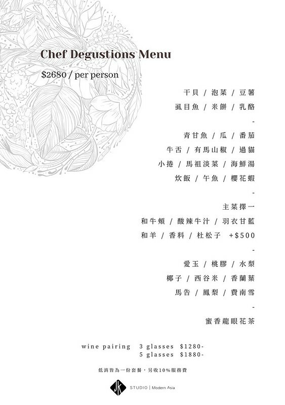 這是當晚我們享用的晚餐,每人是2680元,同時提供3杯1280和5杯1880的餐酒服務。就帶路友人的說法,JK STUDIO Modern Asia的總監待過「樂沐」、「raw」等星級餐飲集團,設計出的菜單脈絡很廣,看了一下menu的食材也的確有很多想像的空間。在用餐之前。