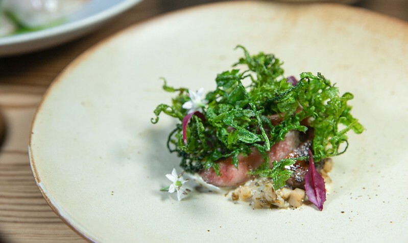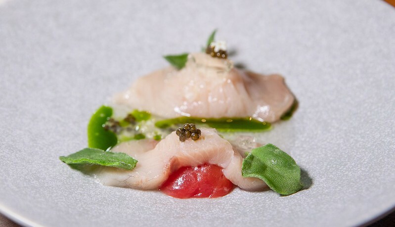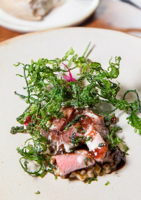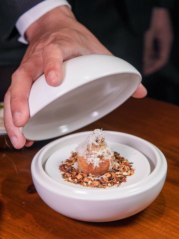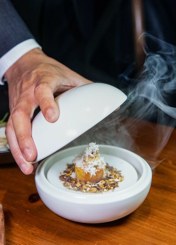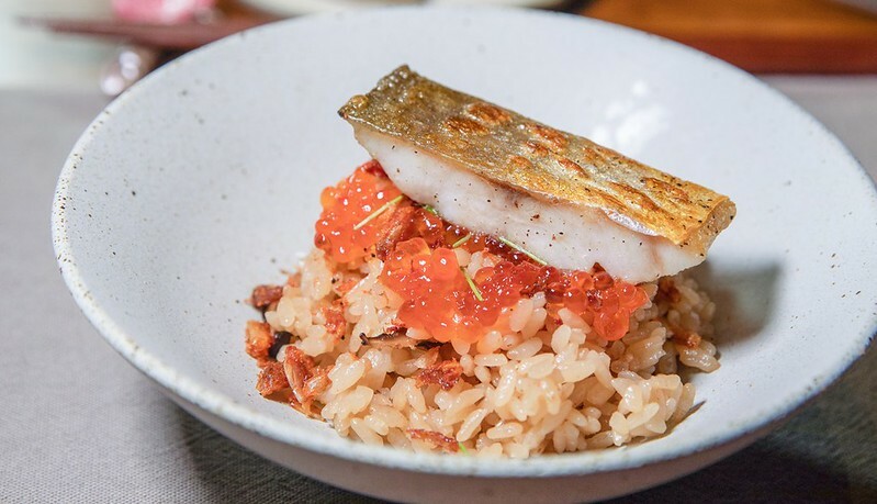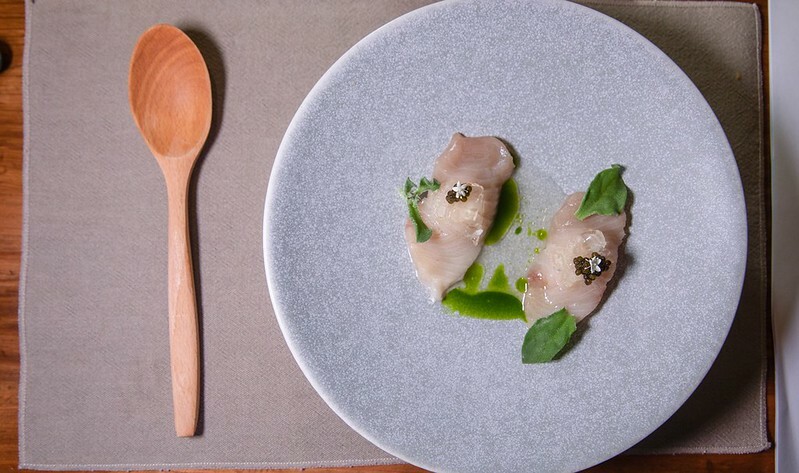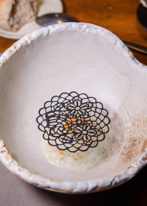 虱目魚/米餅/乳酪,虱目魚有著淡淡煙燻的風味和微茶香、上面是現刨的乳酪絲和像鍋巴的米餅爽脆,是不吃完全無法想像味覺和口感的一道前菜。