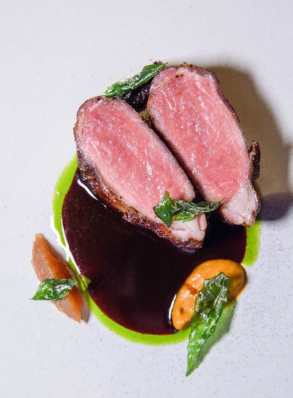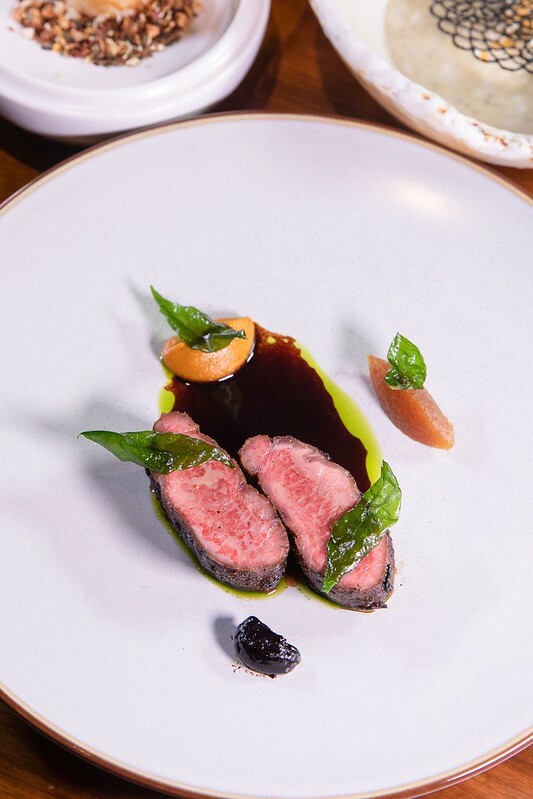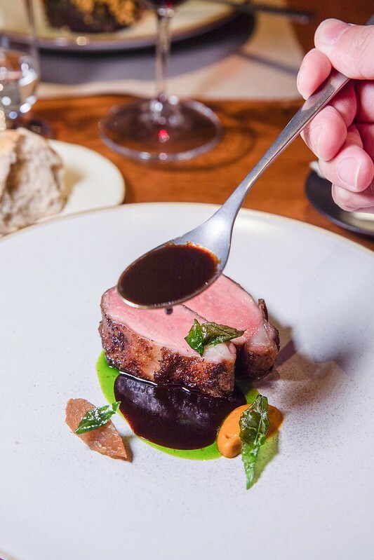 和羊/香料/杜松子+$500,就服務生的說法,用的是紐西蘭的和羊,口感嫩到像極了牛菲力,卻帶著豐厚的羊油香甜,先煎後烤的外皮除了像牛排的酥外,外層焦香並散發著淡淡的咖哩味,細問了才知,原來羊肉有先用糖、鹽、咖哩粉和香料醃過,經煎及烤便散發出不一樣的羊肉鮮香甜。相佐的醬汁是黑蒜泥、加了香料的蘿蔔泥和炒過的蘋果丁,再淋上杜松子、醋調成的醬汁,炸的菜子是咖哩葉。