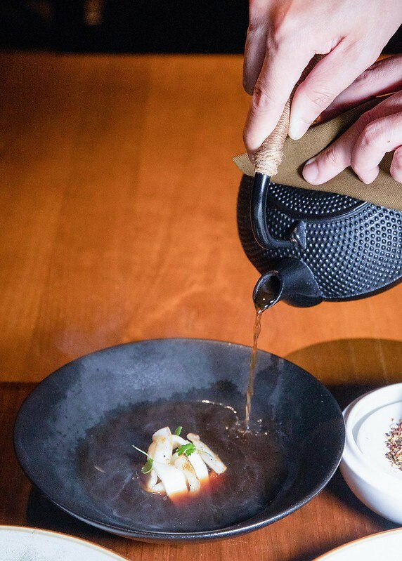 牛舌/有馬山椒/過貓。炙燒過的牛舌爽脆到不行,咀嚼端還有微微的肉汁和油香,底下是以奶油、辣油炒過的菇丁,那滋味、那美味不讓牛舌專美於前,這道最特別的是以炸過的「過貓」,呈現日式炸蔬食的油香,酥酥香香,還帶有一點點山椒的氣息。