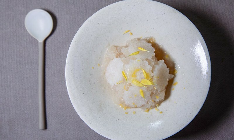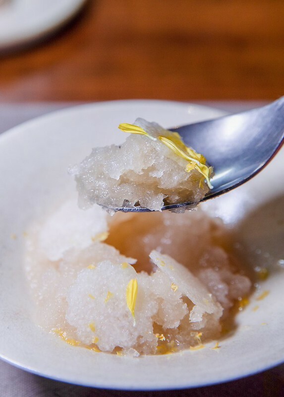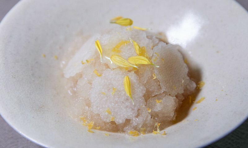 愛玉/桃膠/水梨。第一道甜點是以台灣常見的愛玉加上港式桃膠和水梨(花狀的片)做成的冰沙,清爽、清甜,負責主菜和甜點間的轉味。但,冰沙一般常見於上主菜前,主廚巧妙的把它往後移,變成了主菜和甜點間的切換,也算是顛覆傳統上菜順序,有著一種和客人玩捉迷藏的隱藏樂趣。