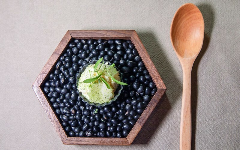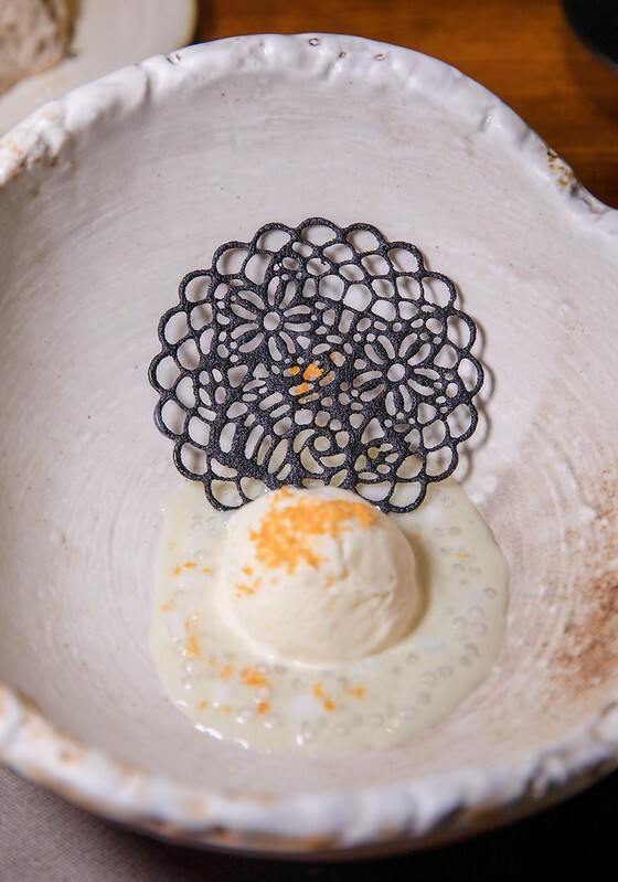 椰子/西谷米/香蘭葉,這道甜點則滿滿南洋風味,又把路邊、平常不過的兩種南洋風甜點、冰品,巧妙的結合加上重新構思,讓整體的視覺大大加分,比較特別的是中間黃色的粉狀,居然是鹹蛋黃,在味覺上也像是主廚調皮的巧思,綴色也點香,至於上面的脆片是糖和椰粉做成的像是南洋建物花窗的模樣。