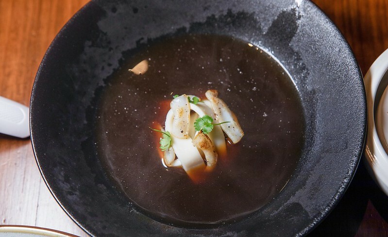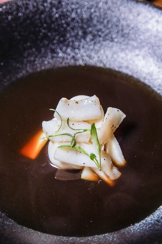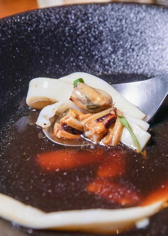 小捲/馬祖淡菜/海鮮湯。一開始以為像板條只是花枝切厚片,沒想到居然是小卷和干貝打成泥後、舖平煮熟後再切成板條狀,口感十分特別且滿是鮮味,湯中還有淡菜和小卷添加鮮味及咀嚼端的樂趣,湯頭則是魚骨和蝦熬出的澄清湯,有一點點龍蝦湯的奧義,超香超好喝。