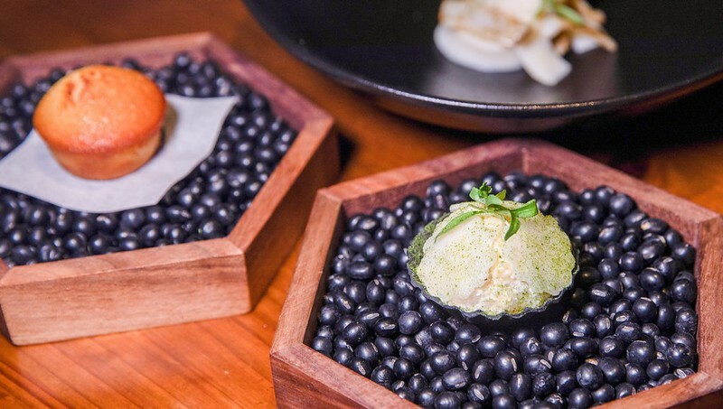 干貝/泡菜/豆薯。上面像花朵的是微脆口感的豆薯片,中間是生食等級的干貝,底下則是像餅乾的竹碳塔皮,中間的干貝和奶黃醬在咀嚼端多了一點化口感,更有趣的是時不時跳出的泡菜味覺,很是特別。