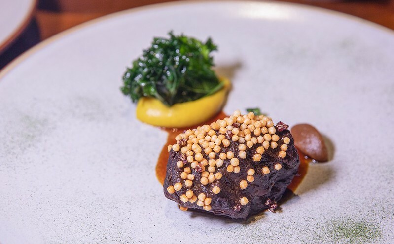 和牛頰/酸辣牛汁/羽衣甘藍,主菜是二選一,這是友人選的和牛頰,我沒吃,但就他說法很嫩很嫩,上面好像是油芒,口感像爆米花油香酥脆。