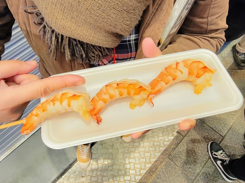 像是用米製作的仙貝串燒製品、又大又鮮甜的鮮蝦串燒等等….