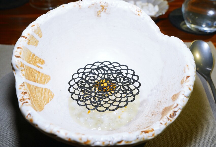 ▼虱目魚/米餅/乳酪是用臺灣小吃虱目魚粥概念設計的菜色,將煙燻虱目魚結合米餅,如鍋巴一樣。在頂部擠上用茶葉煙燻的法式抹醬,放上米果、刨下帕達諾起司。把玫瑰茶葉灑在容器底部用來提升香氣,法式抹醬與起司的鹹度有多層次的堆疊,魚脂香甜誘人與米香的香酥感,令人想起臺灣街頭小吃的特色文化,料理得很優雅也很有草根性。