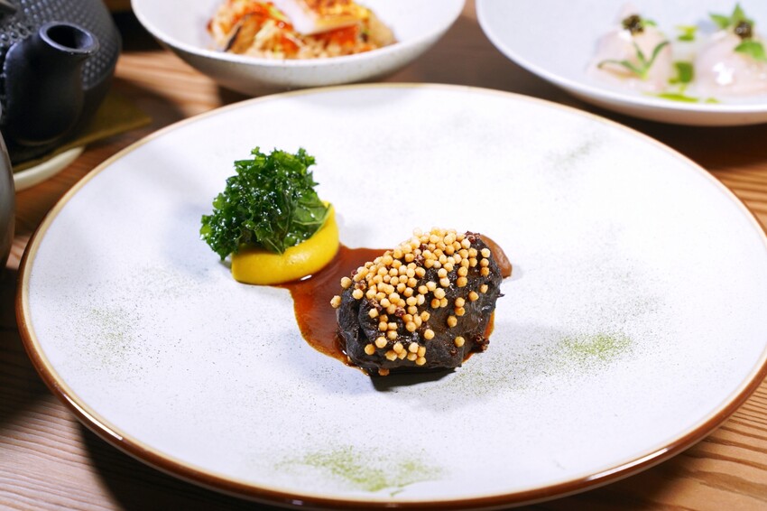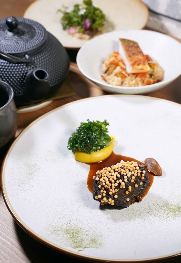 ▼日本生食級青甘魚搭配用梅子醃漬的蕃茄、馬士卡碰起司,用小黃瓜、柴魚高湯當製作的晶凍以及來自澎湖的冰花裝飾,提升鮮味也為菜餚增色。在上桌給客人後,淋上蕃茄澄清湯,魚肉純淨甜軟還富有番茄果香。青甘魚是幕府將軍御用料理,大多在頂級日本料理店才會出現。