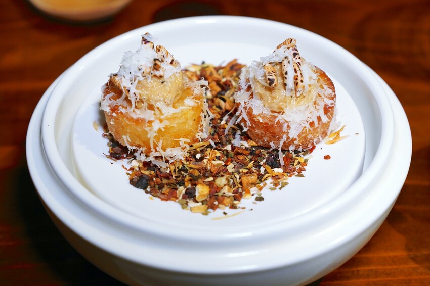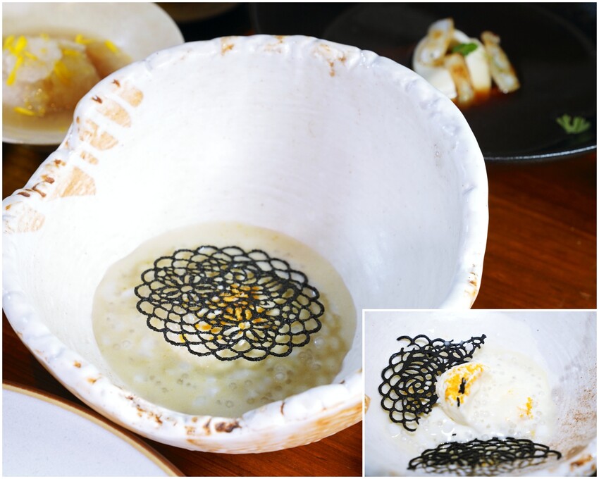 表層是豆薯片花,用來增加口感,在內部加入北海道生食級干貝,用黃金泡菜蛋奶醬調味,黃金泡菜蛋奶醬調味上很輕盈,不會壓過干貝自有的鮮甜,塔殼用竹炭粉製作,有脆度不會過厚。在配色、外型塑造很有小巧精緻甜點的感覺,色彩討喜亮眼。