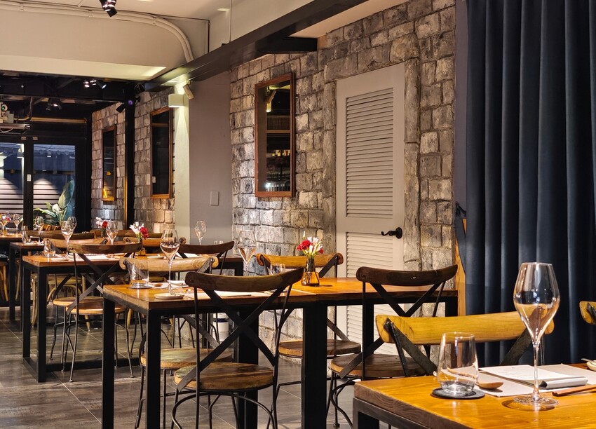 ▼重新裝修後的「JK STUDIO Modern Asia」,以文化石打造牆面,色澤與紋路古樸自然、水泥板材彰顯簡雅素淨、木質傢俱的溫暖調性、深藍色隔間布簾等配置展現如紳士般的穩重、品味與從容。左側深藍色隔間布簾後方設置 16人包廂,整個空間可接待 42人。我們當天入坐包廂,因當天同行朋友已經入座故無拍攝。
