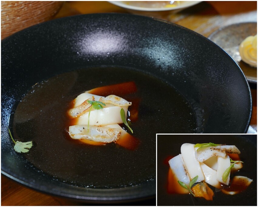 ▼用干貝及小卷打成漿,塑形後,製作出香又軟的粄條,無添加澱粉讓減醣者放心吃。焦黃的是炙燒後的小卷,也加入了淡菜貝肉塊。淨化後的澄清湯呈現飽滿琥珀色,湯質輕透無雜質,味道濃郁厚重盡是鮮味。