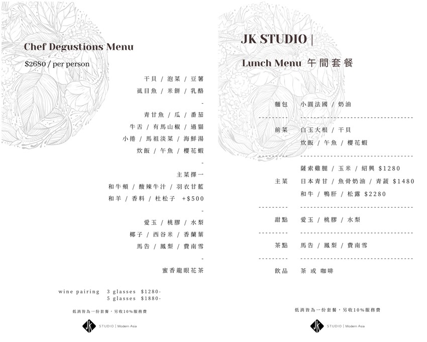 JK Studio Modern Asia 在啟動轉型計劃時,聘請曾在台中「樂沐」與台北「RAW」餐廳服務的 Bally 擔任廚藝總監,Bally 的專長是法餐,與創始人達成「做出市場區隔,創造專屬於亞洲人 Fine Dining」的共識,融合亞洲各國在地食材,用法餐手法料理,希望來客從生活中感受 Fine Dining,去除對法餐昂貴、有距離感的印象 。目前上線的菜單有: