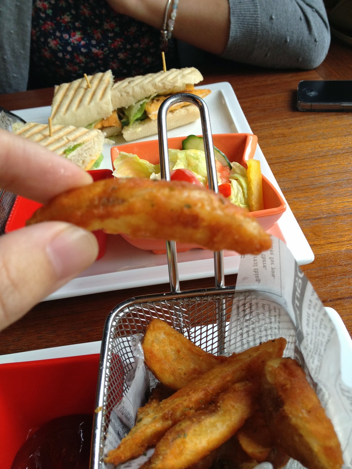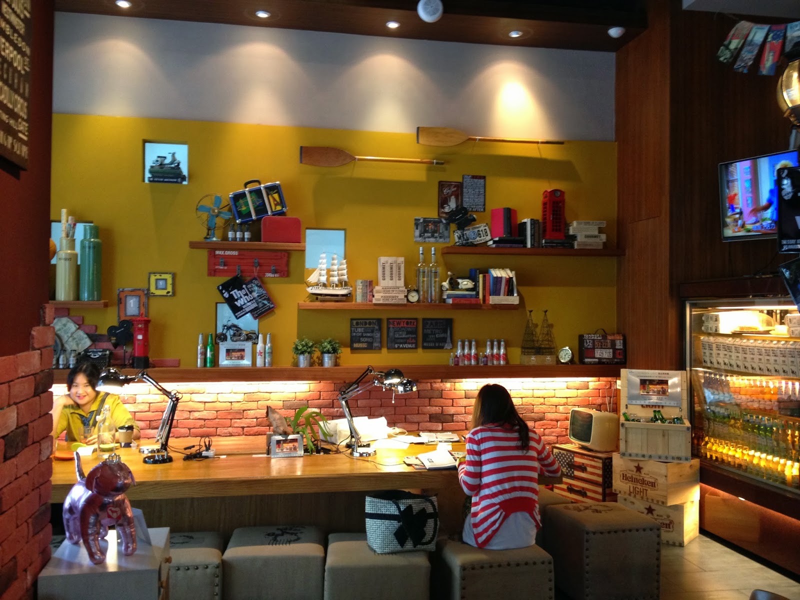 大量採用木製桌子; 紅磚; 以及黃色燈光