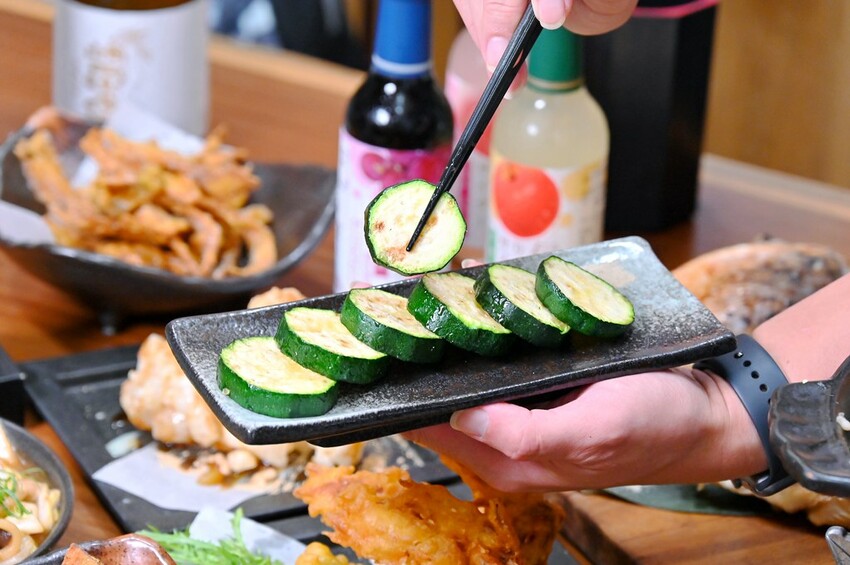 「烤櫛瓜」也是非常厚切,表層留下燒烤烙痕與香氣,櫛瓜本身依舊保留水嫩多汁口感,厚切口感相當不錯。