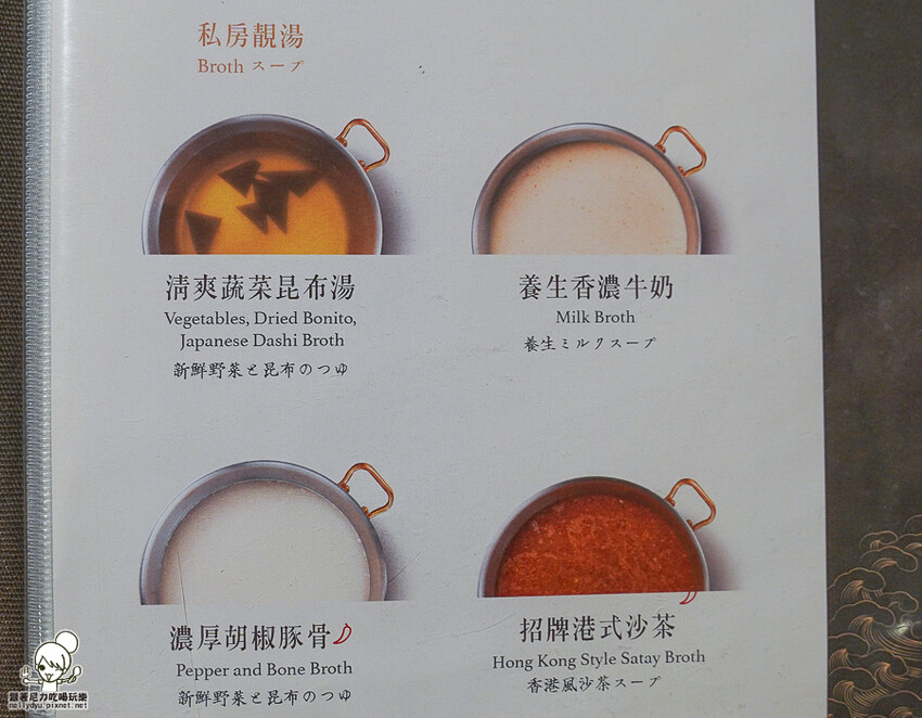 清爽蔬菜昆布湯、養生香濃牛奶、濃厚胡椒豚骨、招牌港式沙茶