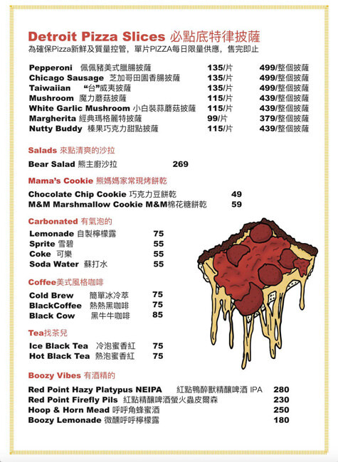 【PIZZA BEAR CAFE】以美國底特律風格的披薩為特色,目前共有七款甜鹹不同的口味,可以購買單片或是整個披薩,還有熊主廚沙拉、熊媽媽家常現烤餅乾,以及酒精及無酒精飲品可點選。