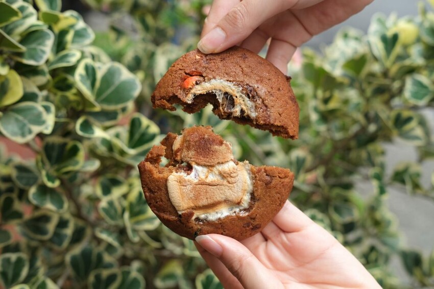 ▼甜點控不能錯過的M&M棉花糖餅乾,是道地經典的美式軟餅乾路線,中間夾有MM巧克力和棉花糖,咬下去鬆軟濕潤,烤過後吃起來半熔岩的甜香邪惡又快樂。