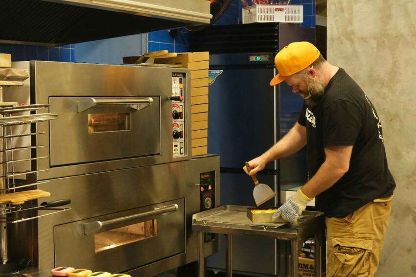 ▼【PIZZA BEAR CAFE】採取半開放式的廚房設計,可以看到老闆鬍子熊大廚製作的過程,以純手工揉製的麵糰,打造出Q彈實的底特律風格餅皮,披薩邊則是用切達芝士烘烤而成,跟外面吃到的披薩口感很不一樣!