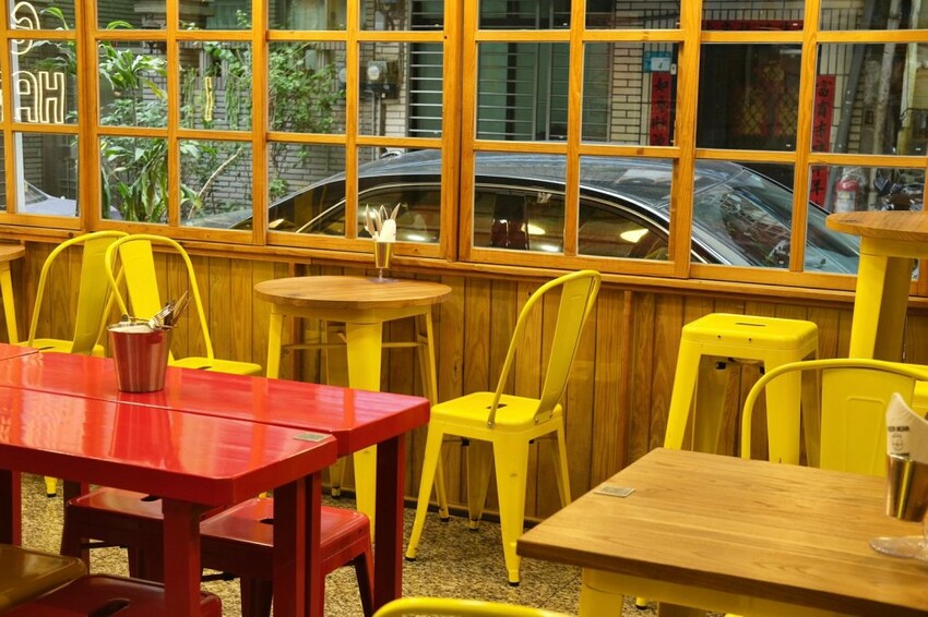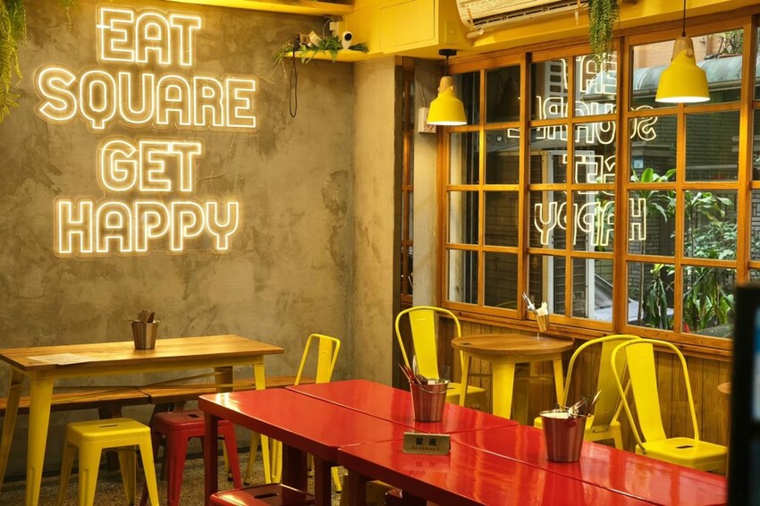 ▼【PIZZA BEAR CAFE】用餐環境使用大量的黃色與紅色系,從牆面到桌椅都充滿繽紛與活潑,搭配標語『EAT SQUARE GET HAPPY』,還有帶點異國鄉村風的輕快音樂,展現出愜意的美式底特律風格!