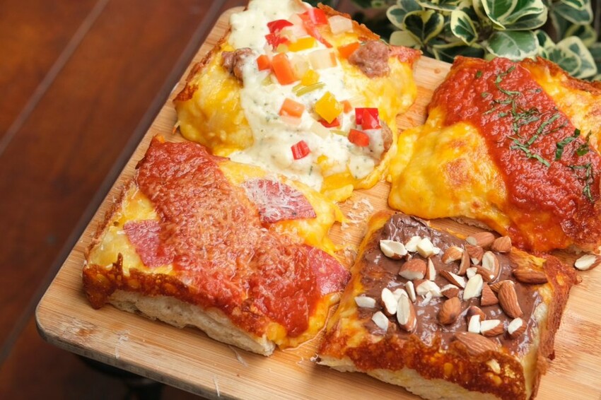 ▼適合選擇障礙滿足的吃四方披薩,一次能夠享有四種不同口味,包含佩佩豬美式臘腸、經典瑪格麗特、芝加哥田園香腸和榛果巧克力甜點口味。