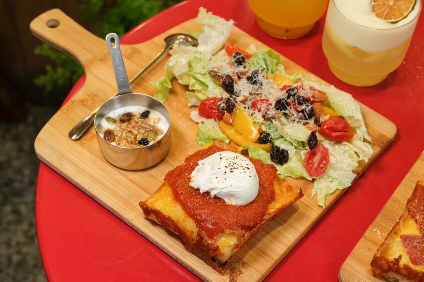 ▼假日限定供應的早午餐ㄅㄧㄥˋ ㄅㄧㄤˋ培根蛋,包含一份方型披薩、沙拉和優格碗,整份吃完會超有飽足感,披薩頂頭放上顆半熟蛋,切開後蛋液瞬間湧出,搭配邊邊的焦脆起司口感,大口咬下又香又滿足~