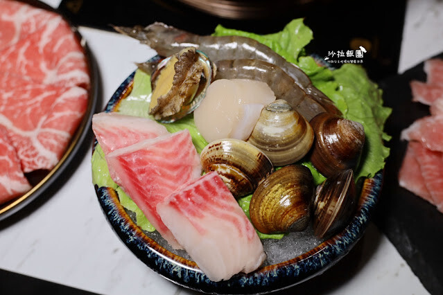 主餐點任一肉品,即可加購小海陸,海鮮盤中有蛤蜊、干貝、鮮蝦、鮑魚、鯛魚
