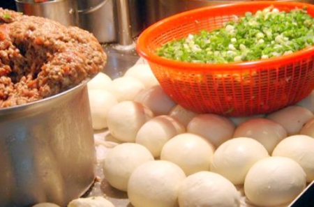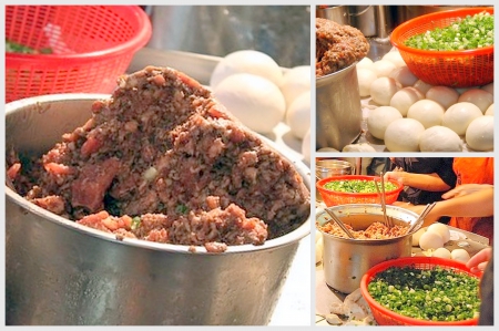 肉餡,滿得快爆出來了...紅通通的,幾乎都是瘦肉ㄟ,一大籮筐的蔥花,