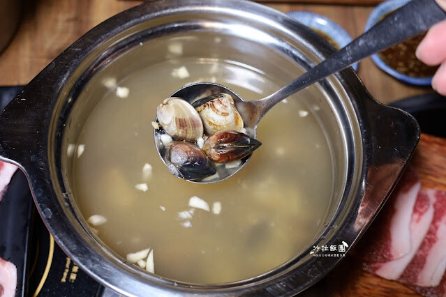 身為蛤罵控,另一鍋沙拉加價升級"蛤蜊蒜香",加入肉品和蔬菜後,湯好甜喔
