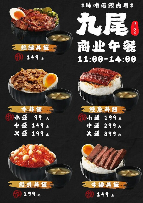 【九尾】的商業午餐,提供雞腿、牛、牛排、鰻魚、鮭貝5種美味的平價丼飯。