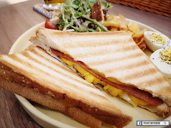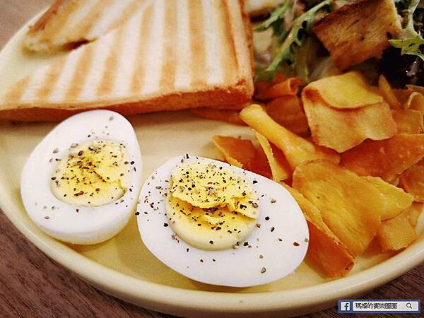這類輕食的份量不算多,適合胃口不大的女生,裡面除了熱壓吐司外,附有健康生菜、水煮蛋和微甜地瓜片。
