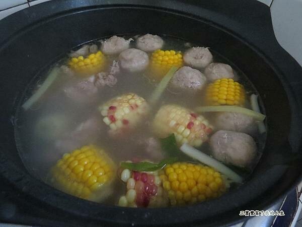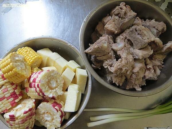 1.將山藥削去外皮,切塊清淨備用,玉米也切段備用~