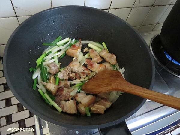 3.鍋中不必放油,慢慢放入五花肉,利用豬肉本身的油脂烹調就可以了~