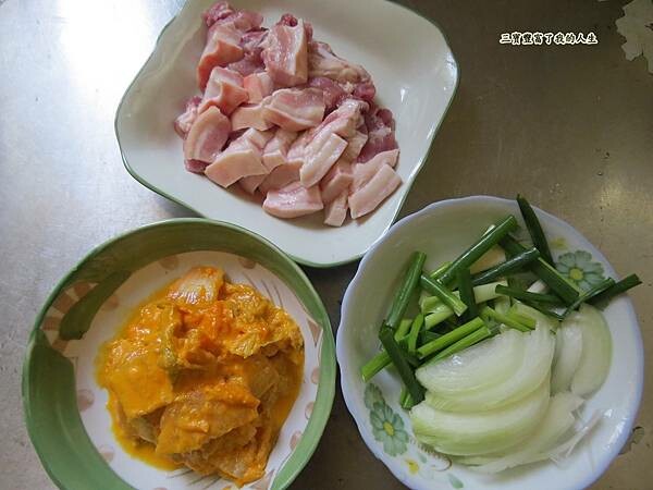 1.五花肉切片、洋蔥切絲、青蔥切絲備用