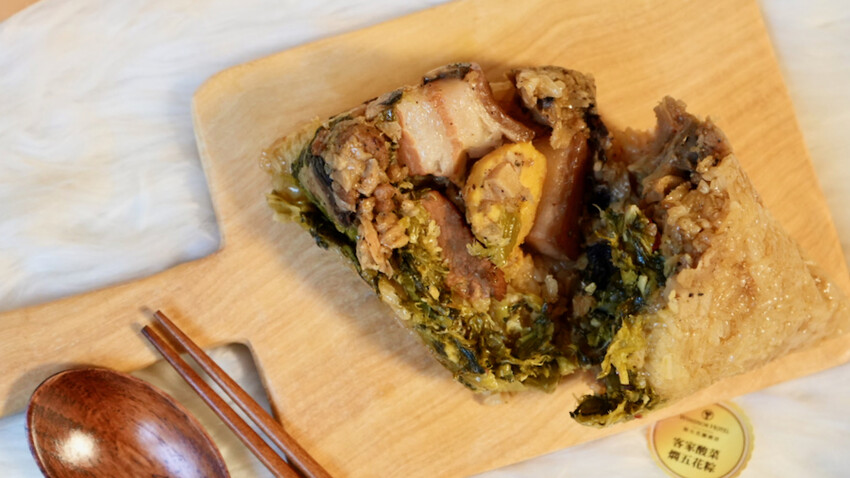 撥開粽子後,可以看到裡面有超多料,秘醬滷製的溫體豬五花、鹹蛋黃、香菇、筍丁、碎脯、冬蝦,當然還有客家傳統酸菜,入口後真的就像在吃客家酸菜五花肉。