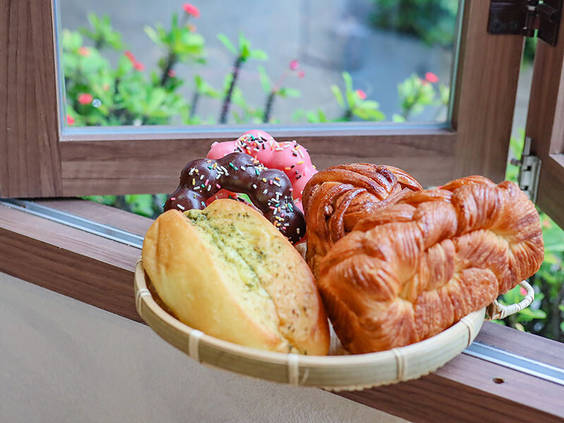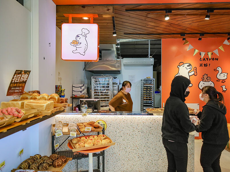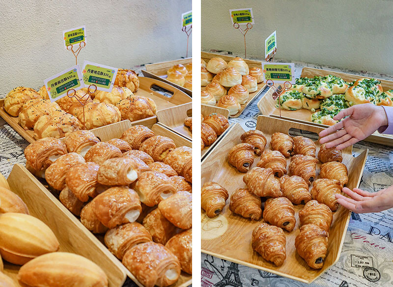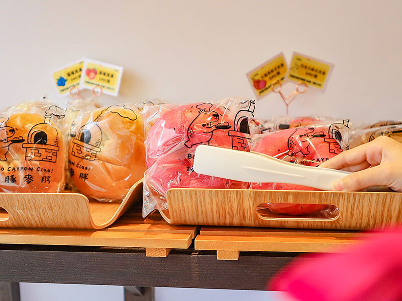 麵包的挑選區域以暖白色系加上木質陳列為主相當溫馨,左側是熱門的吐司、肉桂捲等,依序是3個$100的創意、古早味麵包區,右側窗台前是4個$100,有小饅頭、可頌等適合小朋友人手一顆小點心;簡約的櫃後之後就是水豚麥胖的烘焙區,香噴噴的麵包就是從這裡出來的囉~