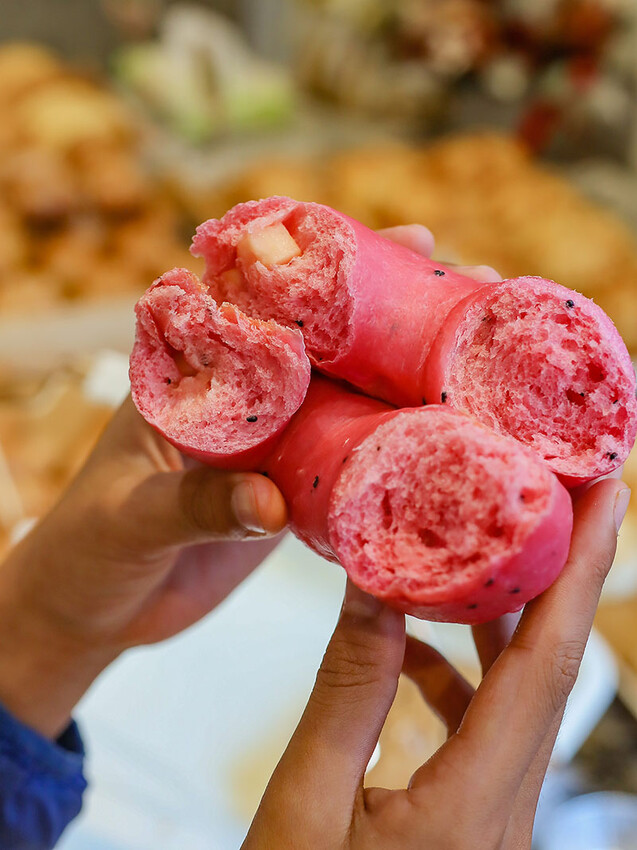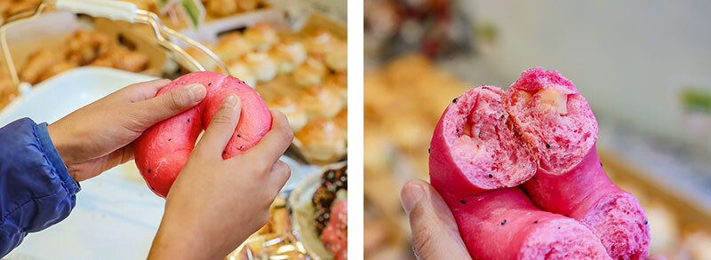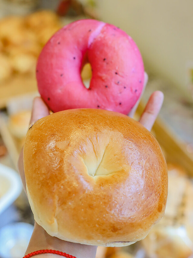 火龍果是創意的軟式貝果,直接把火龍果融入麵包體中,口感蓬鬆Q潭,裏頭還吃得到起司~兩種風味可有所喜,一次帶走可以慢慢品嘗~